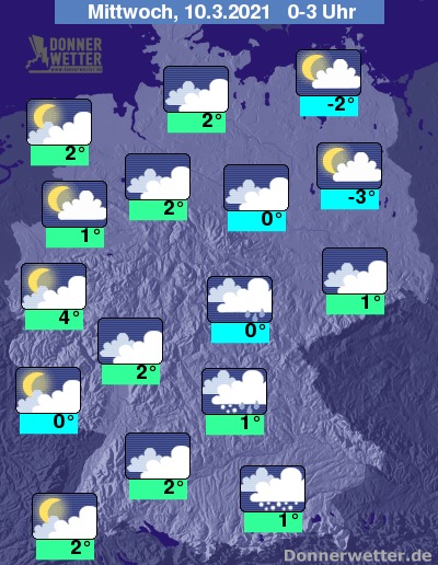 In der Nacht auf Mittwoch zeigt sich der Himmel im Nordosten sowie entlang des Rheins meist locker oder aufgelockert bewölkt, in den restlichen Landesteilen bleibt die Wolkendecke meist geschlossen. In der Südosthälfte des Landes sowie den östlichen Mittelgebirge muss immer wieder mit Regen- oder Schneeregen gerechnet werden, oberhalb von 400 m fällt auch Schnee.