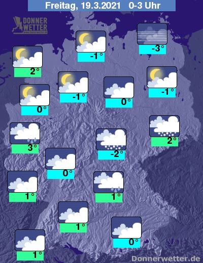 In der Nacht auf Freitag zeigt sich der Himmel über der Nordhälfte des Landes zunächst noch wechselnd oder stark bewölkt, in den frühen Morgenstunden lockert es hier dann zunehmend auf; im Nordwesten funkeln die Sterne auch von einem wolkenlosen Himmel. In der Südhälfte des Landes bleibt es meist wolkenverhangen und vor allem in den südöstlichen Landesteilen fällt gebietsweise Schneeregen oder Schnee.