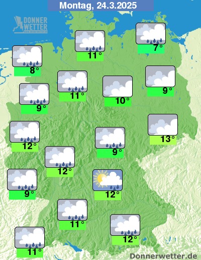Am Montag zeigt sich der Himmel über weiten Landesteilen wechselnd oder stark bewölkt, teils ist der Himmel auch bedeckt; dabei muss am Montag gebietsweise mit teils anhaltendem Regen gerechnet werden.