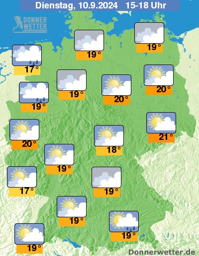 Am Dienstagnachmittag zeigt sich der Himmel über weiten Landesteilen wechselnd bewölkt und es sind nur selten Schauer möglich. Zum Abend hin verdichten sich die Wolken von Nordwesten her und es muss in Folge mit schauerartigem und teils gewittrigem Regen gerechnet werden. Im Westen und Nordwesten weht ein teils böiger Wind, an der Nordseeküste stürmisch.