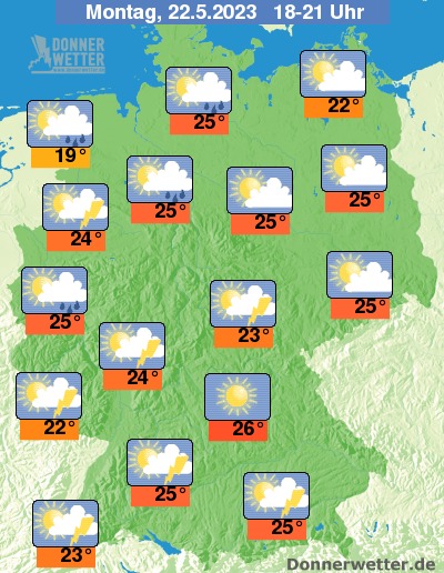 Heute Abend kommen die dichten Quellwolken mit teils kräftigen Schauern und Gewittern weiter ostwärts voran und erreichen etwa die Westhälfte der Republik. Weiter nach Osten hin sind auch hier und da einige Quellwolken möglich, sonst scheint aber oft die Sonne und das Schauer- und Gewitterrisiko ist weitgehend gering. Die Temperatur liegt bei 19 Grad in Wilhelmshaven und 26 Grad in Nürnberg.