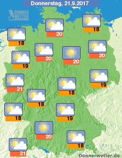 Am Donnerstag ist es über dem Land verbreitet heiter oder sonnig, dabei bleibt es trocken. Die Temperatur steigt auf recht einheitliche Werte zwischen 18 und 21 Grad.