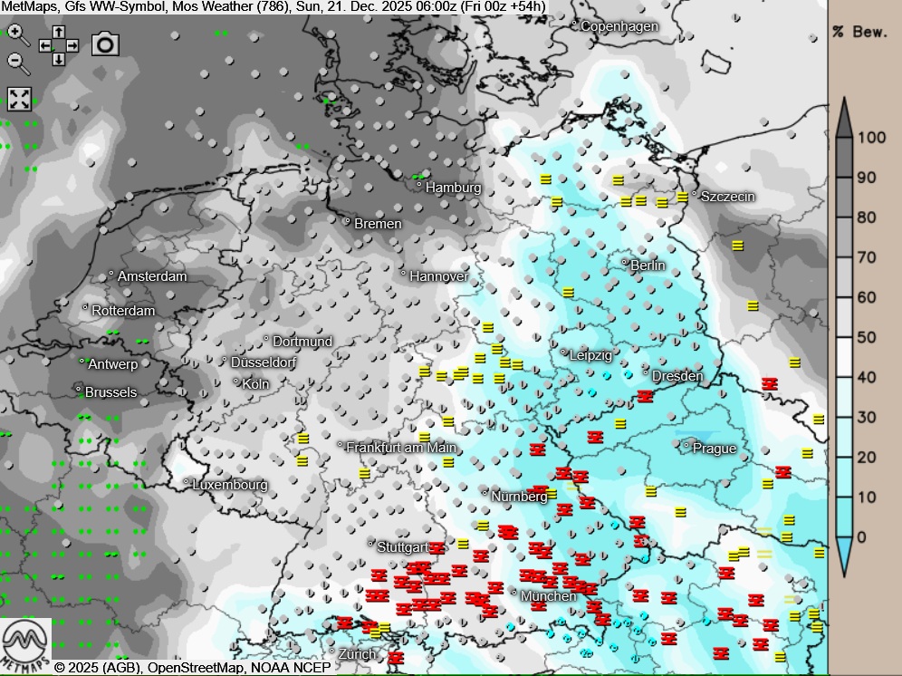 Am Sonntag zeigt sich der Himmel über weiten Landesteilen wechselnd oder stark bewölkt, lokal ist es auch längere Zeit neblig-trüb. Größere Auflockerungen beschränken sich vor allem auf die Höhen der Mittelgebirge und den Alpenrand. Es bleibt niederschlagsfrei.