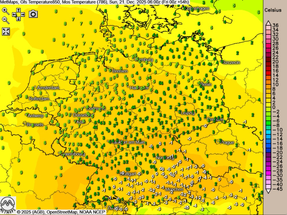 Die Wetter- und Temperaturkarte für Sonntagfrüh nach GFS: