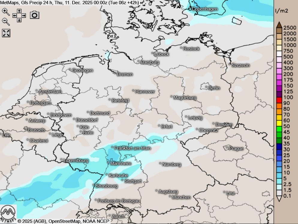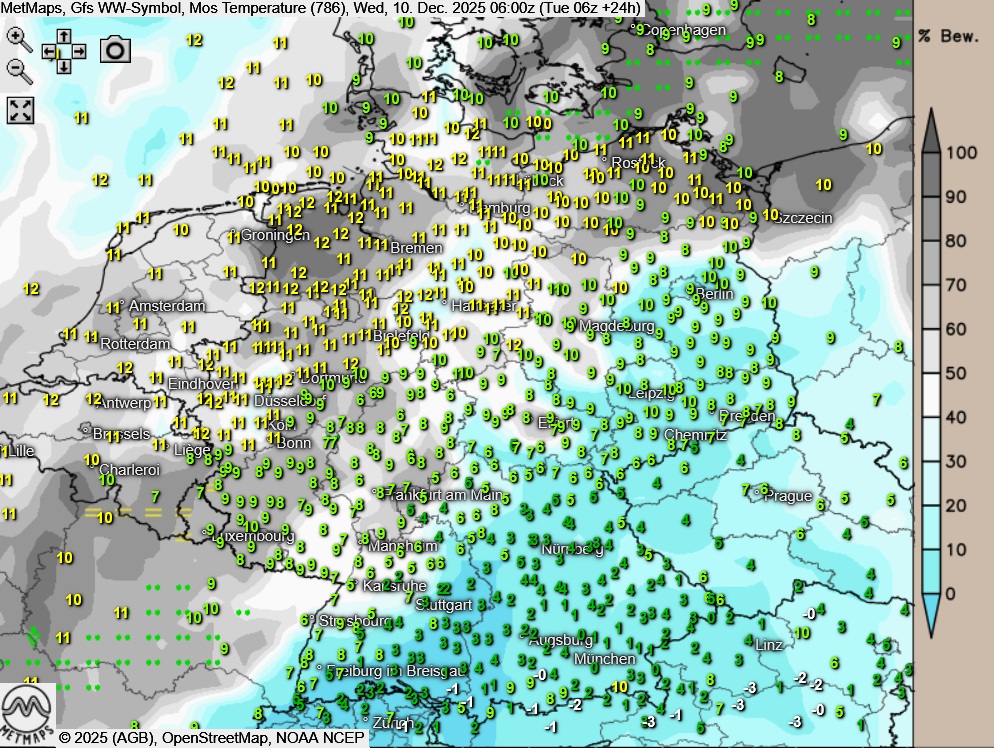 Die Wetter- / Temperaturkarte für Mittwochfrüh sowie die 24-Stunden-Regenmengen am Mittwoch nach GFS: