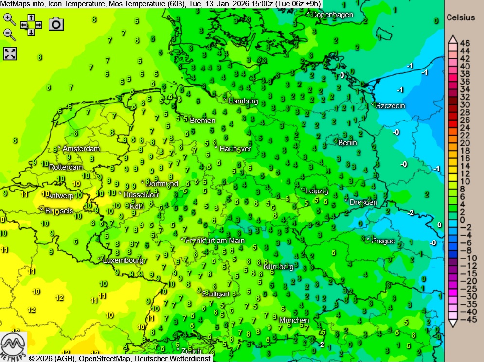 Die Temperaturen erreichen am Nachmittag Werte um 4 bis 13 Grad.
