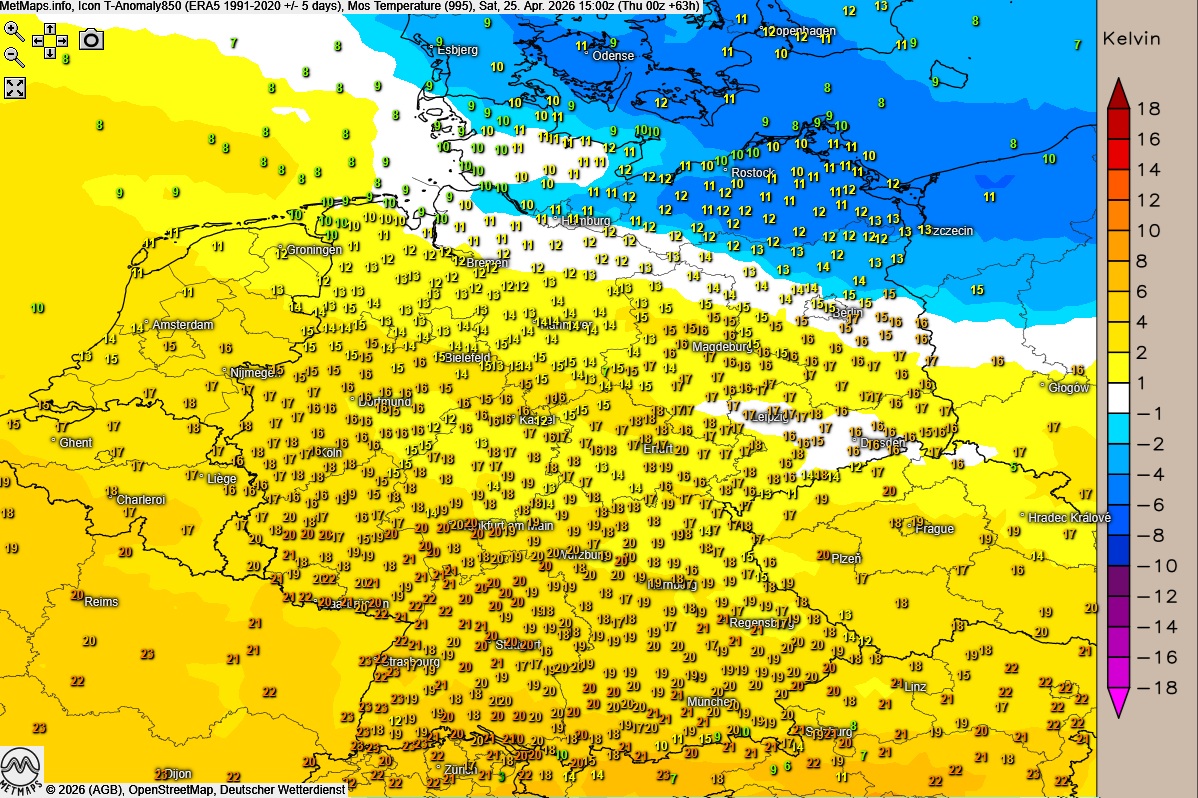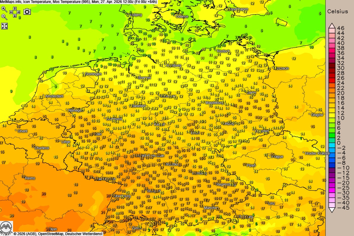 Deutlich verhaltener zeigt sich das Wetter von der Nordsee bis zur Oder: Hier ziehen immer wieder dichte Wolkenfelder durch, die den Sonnenschein einschränken, es bleibt aber weitgehend trocken. Bei mäßigem, an der Nordsee bereits böig auffrischendem Nordwestwind liegen die Höchstwerte im Norden und Osten zwischen 13 und 17 Grad.