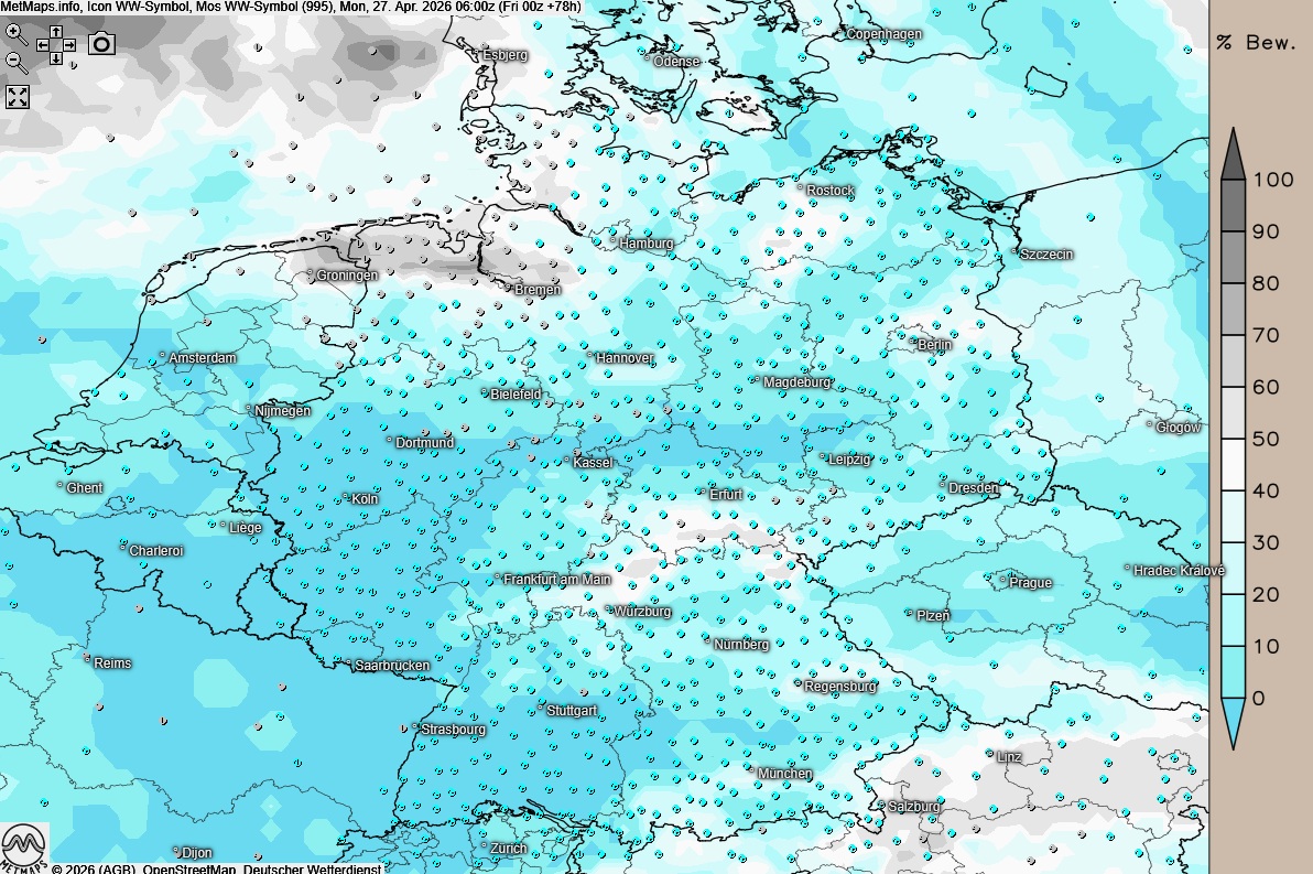 Die Wetter- und Temperaturkarte für Samstagfrüh (04:00 Uhr) nach ICON: