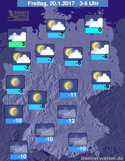 So werden in der Nacht auf Freitag, etwa im Süden des Landes, Tiefstwerte deutlich unter -10  Grad C erreicht: