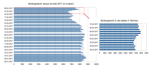 Die Auswertung des Lysimeters an unserer Wetterstation in Bonn im Zeitraum Januar bis Anfang Mai ist auf den beiden nachfolgenden Grafiken zu sehen. Markant ist das vor allem in der zweiten und dritten Aprildekade geringe Bodengewicht aufgrund der anhaltenden Trockenheit: