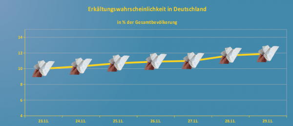 Nach der ersten Erkältungswelle im Oktober rollt nun eine zweite über Deutschland hinweg - über 10 % der Bevölkerung werden im Laufe der Woche mit einer Erkältung oder Grippeerkrankung zu tun haben.