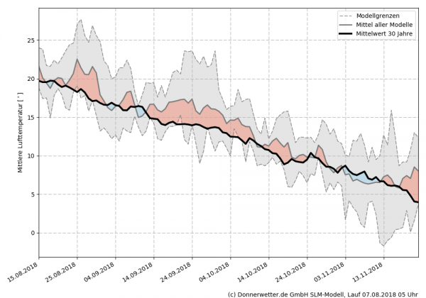 Der Blick auf unsere Grafiken zeigt: Die aktuellen Langfristmodelle gehen im Westen auch in den kommenden Wochen von überdurchschnittlich warmen Temperaturen und deutlich über dem langjährigen Mittel liegenden Anzahl an Sonnenstunden aus. Die Trockenheit wird uns weiter begleiten, dennoch steigt das Schauerrisiko im weiteren Verlauf des Spätsommers phasenweise an.