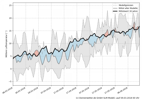 Nach einer zu kalten Wetterphase erreichen die zu erwartenden Mitteltemperaturen laut aktueller Berechnungen ab der letzten Monatsdekade wieder überdurchschnittliche Werte, bevor es Anfang April wieder "bergab" geht. Die Niederschlagsmengen liegen dabei meist meist leicht über dem Mittel, die Anzahl der prognostizierten Sonnenstunden darunter.