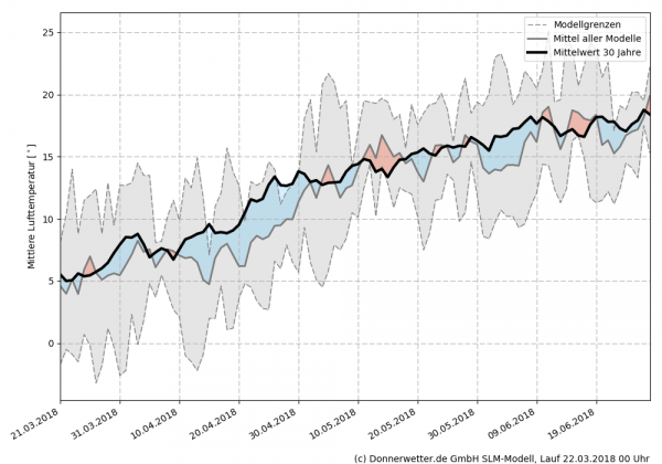 Nach einer leicht zu trockenen Phase, in der sich auch immer wieder die Sonne zeigt, liegen die zu erwartenden Niederschlagssummen ab Anfang April wieder häufig über dem langjährigem Mittel. Die Temperaturen bewegen sich dabei meist unter dem Durchschnitt.