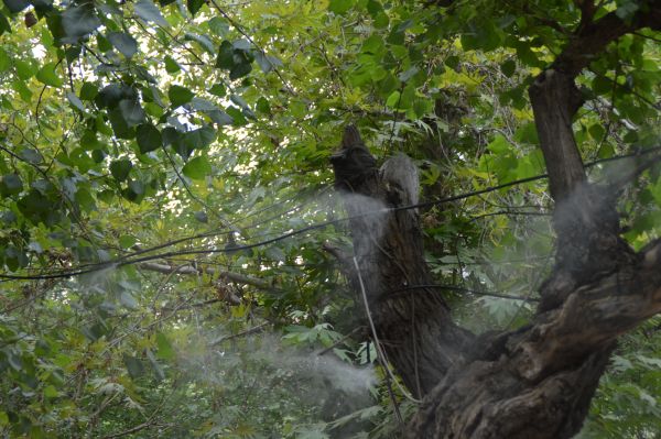 Aktuell liegen die Temperaturen in diesem Teil des Landes ähnlich hoch wie bei uns, 40 Grad C in Schatten sind im Sommer hier aber keine Seltenheit. Für den Tee zur Mittagsstunde ist es auch den hitzeerprobten Einwohnern zu heiß. Um die Luft abzukühlen und das Leben an der frischen Luft erträglicher zu machen, versprühen hier in vielen Außenanlagen mit kleinen Düsen versehene Gartenschläuche feinen Sprühnebel.