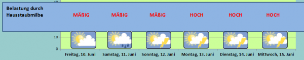 Auf die Hausstaubbelastung wirkt sich die hohe Luftfeuchtigkeit nicht unerheblich aus. Vor allem in der neuen Woche ist ein hohes Allergiepotential zu erwarten.