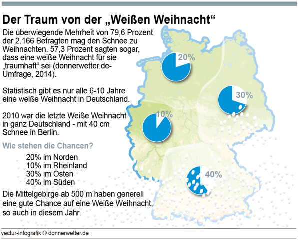 Doch statistisch gesehen ist die Weiße Weihnacht in weiten Teilen des Landes eher die Ausnahme als die Regel. Nur alle sechs bis zehn Jahre liegt an den Weihnachtsfeiertagen Schnee, in Köln nur etwa alle acht Jahre, in Hamburg alle zehn Jahre. Weißer sieht es in den Mittelgebirgen und im Süden aus, in München kann man sich im Durchschnitt alle drei Jahre über Weiße Weihnachten freuen.