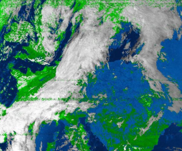 Das Satellitenfoto von heute Nachmittag zeigt ein großes Wolkenband, das sich von der Iberischen Halbinsel, über Frankreich, Benelux und Deutschland bis nach Skandinavien hin erstreckt. Hierbei handelt es sich um eine Okklusionsfront, die warme Luftmassen südöstlich der Front von deutlich kältere Luft nordwestlich der Front trennt. Unter dem kompakten Wolken fällt oft langanhaltender, teils auch schauerartiger Regen.
