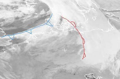Deutschland liegt derzeit zwischen einer Warmfront im Osten und einer Kaltfront über der Nordsee. Dazwischen sorgen meist dichte Wolken gelegentlich für Regen, im Südosten auch noch Schnee.