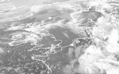 Das steuernde Tief 'Ingo' bei Irland ist auf dem Bild vom Montagmorgen kaum noch zu erkennen. Deutlich käftiger fällt dagegen der zugehörige Tiefausläufer aus. Unter seinen hohen Wolken verbirgt sich eine Gewitterfront über Süd- und Ostdeutschland.