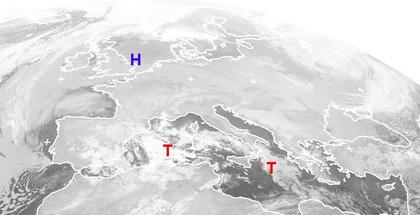 Auf dem Satellitenbild von Samstag früh ist eine Hochnebeldecke vor allem über Deutschland und Polen gut zu erkennen. Das Hoch 'Zeno' über England und der Nordsee sorgt für dieses ruhige aber meist trübe Wetter. Im Mittelmeer bringen zwei Tiefdruckgebiete örtlich Schauer oder Gewitter. (Bildquelle: NERC Satellite Receiving Station, Dundee University, Scotland, http://www.sat.dundee.ac.uk/)