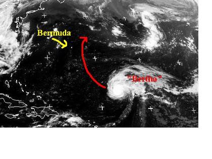 Der Hurrikane 'Bertha' befindet sich auf dem Satellitenbild von Mittwoch früh weiterhin nordöstlich der Karibik. Zur Zeit erreicht er mittlere Windgeschwindigkeiten von 130, in Böen 155 km/h, und hat sich damit im Vergleich zu gestern etwas abgeschwächt. Berechnungen zufolge soll er langsam nordwärts ziehen, wobei die Bermuda-Inseln in seinen Einflussbereich geraten könnten. Sein Endziel ist allerdings noch unklar. (Bildquelle: NERC Satellite Receiving Station, Dundee University, Scotland, http://www.sat.dundee.ac.uk/)