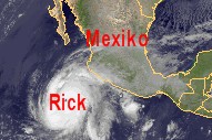 Auf dem Satellitenbild von heute zeigt sich der Hurrikan 'Rick' nur wenige 100 Kilometer südwestlich der mexikanischen Westküste. Zur Zeit erreicht 'Rick' durchschnittliche Windgeschwindigkeiten um 200 km/h und in Böen teils bis 240 km/h. Auf seinem weiteren Weg nach Norden nähert er sich voraussichtlich im Laufe des Dienstags der mexikanischen Halbinsel Niederkalifornien. Er wird sich bis dahin etwas abschwächen und erreicht dann voraussichtlich noch Windspitzen bis 200km/h, im Mittel werden schätzungsweise 160 bis 170km/h erreicht. Bei seinem Landgang auf das mexikanische Festland wird er sich im weiteren Verlauf rasch abschwächen.