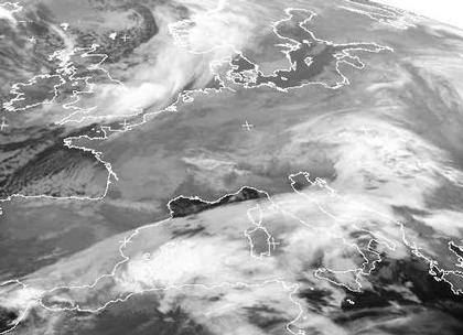 Die Kaltfront des Tiefs 'Donatus' erstreckt sich auf dem Satellitenbild vom Freitagmorgen von Norwegen über die Nordsee bis nach Südengland. Weiter südlich sorgt ein schwaches Zwischenhoch für meist ruhiges Wetter, man erkennt gut die Alpen, über Deutschland hält sich örtlich Schichtbewölkung. Das Tief 'Claus' liegt über dem Dinarischen Gebirge, Wolken seines Frontensystems reichen bis zum Gibraltar.