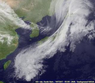Ein Tief sorgt heute über Japan für extreme Regenmengen. Auf dem Satellitenbild ist schön zu erkennen, wie das ganze Land unter den Wolken verschwindet.