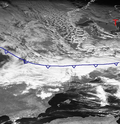 Deutlich zeigt das Satellitenbild von heute Mittag die Wolken und damit auch die Lage der Kaltfront des Tiefs 'Gabrijela' mit Zentrum über der Ostsee. Die Wolken erstrecken sich dabei über Frankreich bis zu den Alpen. Nördlich davon ziehen einige Schauer, die eine Zellenstruktur aufweisen, von der Nordsee kommend nach Mitteleuropa. Mit ihnen gelangt kalte Luft arktischen Ursprungs nach Mitteleuropa, die ihrerseits für den ersten Wintereinbruch der Saison 2008/2009 sorgt. (Bildquelle: Copyrigt EUMETSAT, NERC Satellite Receiving Station, University of Dundee)