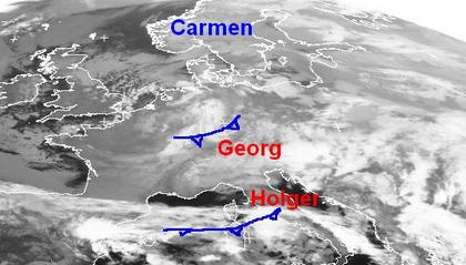 Über Mittel-, Südost- und Osteuropa halten sich viele Wolken, sie gehören einem Tiefdrucksystem über den Alpen und Norditalien. Morgen verlagert sich das Tief „Holger“ nordwärts nach Polen und sorgt für teils kräftigen Schneefall hier und in Österreich. Unter Hochdruckeinfluss bleibt nur Nordskandinavien. Auch auf den Britischen Inseln gibt es ruhiges, oft aber trübes Wetter.