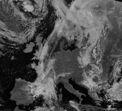 Hochdruckeinfluss und trockene Luft sorgt für weitgehend wolkenfreies Wetter in Deutschland und Italien. Rundherum sorgen Tiefausläufer für mehr Wolken. Zum Teil auffällig deutlich zeichnet sich die Küste des Baltikums ab. Während unter dem Einfluss von Hoch 'Kuno' auf dem Land schon die Sonne scheint, hält sich über der kalten Ostsee noch Nebel.