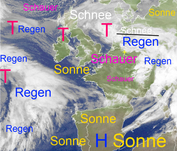 Draußen auf dem Atlantik erkennt man den nächsten mächtigen Wolkenwirbel, der morgen den Südwesten mit neuen Regenfällen erreicht. Somit steigen die Pegel der Flüsse weiter an. Die Luftmassengrenze kommt allmählich wieder südwärts voran, so dass über der Mitte unseres Landes und eventuell auch wieder weiter südlich aus den Tropfen wieder Flocken werden können.