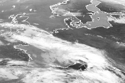 Weite Teile Deutschlands zeigen sich heute Morgen unter dem Einfluss von Hoch 'Paul' wolkenfrei. Im Südwesten schleißt sich jedoch unmittelbar dichte Bewölkung an. Eine Tiefdruckrinne erstreckt sich von Norditalien zu den Britischen Inseln und bringt hier Regen. (Bildquelle: NERC Satellite Receiving Station, Dundee University, Scotland, http://www.sat.dundee.ac.uk/)