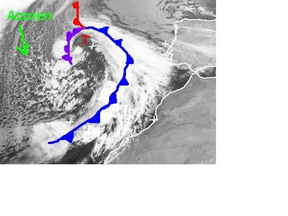 Auf dem Satellitenbild von Dienstag früh sind die Ausläufer eines Tiefs östlich der Azoren gut zu erkennen. Seine Kaltfront reicht fast bis an die Nordwestküste von Afrika. In der auf ihrer Rückseite einströmende Kaltluft entwickeln sich teils kräftige Schauer und Gewitter. Vor allem die Azoren und die Kanarischen Inseln sind davon betroffen. (Bildquelle: NERC Satellite Receiving Station, Dundee University, Scotland, http://www.sat.dundee.ac.uk/)