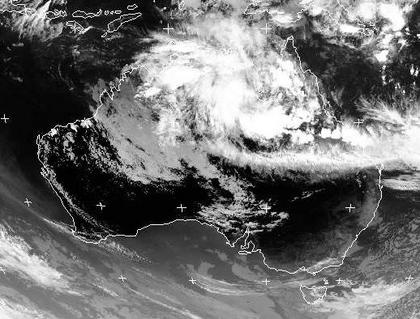Auf dem Satellitenbild von Mittwoch früh sind Schauer- und Gewitterzellen im Norden und Nordosten von Australien gut zu erkennen. Die Hochreichenden, und damit kalten Wolkenoberkanten (im Infrarotbild weiß dargestellt) heben sich stark vom warmen Erdboden ab (im Infrarotbild schwarz dargestellt).