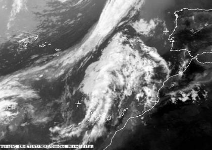 Der Ausschnitt zeigt eine Wolkenformation die an ein Tief erinnert, jedoch handelt es sich dabei nur um eine schwache Kaltfront. Man erkennt das an der Abwesenheit der typischen Quellbewölkung, die sich in der kalten Luftmasse normalerweise bildet: bei einem Tief würden westlich der kapverdischen Inseln solche Quellwolken zu erkennen sein.