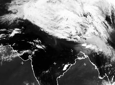 Auf dem Satellitenbild ist schön die scharfe Abgrenzung zwischen Himalaya, der schneebedeckt ist, und dem Indischen Subkontinent. Dabei herrschen extreme Temperaturunterschiede auf engsten Raum. In Indien werden über 30 Grad erreicht, während es im Bergland frostig ist.