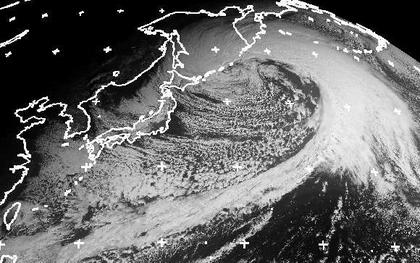 Ein Tief über den Kurilen lenkt von Sibirien her kalte Luft auf den Pazifik. Dabei entstehen über den Meeren Schnee- und Regenschauer. Vor allem auf der Nordseite der japanischen Gebirge fällt daher Schnee. (Bildquelle: NERC Satellite Receiving Station, Dundee University, Scotland, http://www.sat.dundee.ac.uk/)