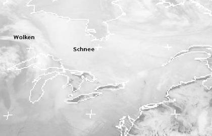 Im Nordosten Kanadas liegt derzeit eine geschlossene Schneedecke, diese ist besonders kalt. Dies kann man am Satellitenbild sehr gut sehen, denn der Schnee hat dieselbe Färbung wie die hohen Wolken, die etwa -40 Grad kalt sind.