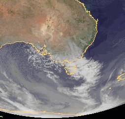 Der Ausläufer eines Tiefs südlich von Tasmanien überquert von Westen her den Südosten des australischen Kontinents. Seine dichten Wolken bringen dabei teils Regen. Auf seiner Rückseite folgt von Südwesten Kaltluft. Dabei haben sich über dem Meeresgebiet westlich von Tasmanien zahlreiche lockere Schauerwolken gebildet.