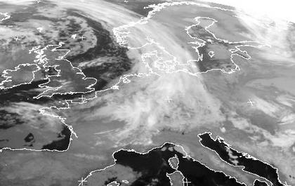 Das Tief 'Ernst' mit Zentrum über dem Nordmeer schickt einen Ausläufer mit einem Wolkenband nach Mitteleuropa. Es bringt heute in Deutschland erst Schnee, dann Regen.