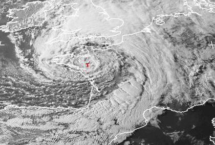Das Tief 'Marian' über der Bretagne führt an seiner Vorderseite starke Bewölkung und Regenfälle nordostwärts. Es kommt hier zu teils ergiebigen Niederschlägen, die auch Deutschland erreichen. An der Westseite von Großbritannien strömt kalte Luft über den Atlantik nach Frankreich ein. (Quelle: http://www.sat.dundee.ac.uk)