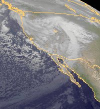 Ein kräftiges Tiefdruckgebiet liegt über dem Westen der USA, wo es verbreitet für Regen oder teils auch Schnee sorgt, dazu ist es teils auch stürmisch. Seine Kaltfront erstreckt sich entlang eines Wolkenbands, das über Niederkalifornien hinweg weit auf den Pazifik reicht. Auf ihrer Rückseite ist kalte Luft weit nach Süden vorgedrungen. Über dem wärmeren Wasser des Pazifiks haben sich dabei lockere Schauerwolken gebildet.