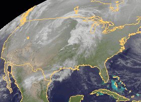 Über der Mitte der USA liegt derzeit ein kräftiger Tiefdruckwirbel. Vor allem im Bereich der Bewölkung, die zwischen den Großen Seen und dem Golf von Mexiko nach Osten zieht, kommt es auch zu teils kräftigem Regen.