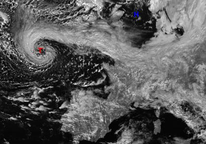 Auf dem Satellitenbild von Dienstag früh ist ein Wolkenwirbel über dem Atlantik gut zu erkennen. Er gehört zu Tief 'Vija' westlich von Großbritannien, und seine Ausläufer erstrecken sich bis nach Frankreich. Dagegen sorgt leichter Hochdruckeinfluss über der Nordsee für wolkenarmes Wetter in Schottland und Dänemark.