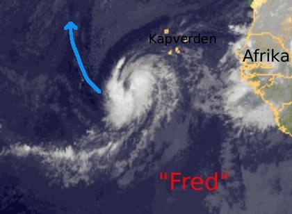Tropensturm 'Fred' hat sich westlichen Atlantik aufgewirbelt und befindet sich nun südlich der Kapverden. Derzeit liegt seine mittlere Windgeschwindigkeit bei 80 km/h. Bis übermorgen verstärkt sich der Wirbelsturm schnell weiter und zieht in nordwestliche Richtung weiter. Die Kapverdischen Inseln könnten dabei von Ausläufern von 'Fred' gestreift werden.