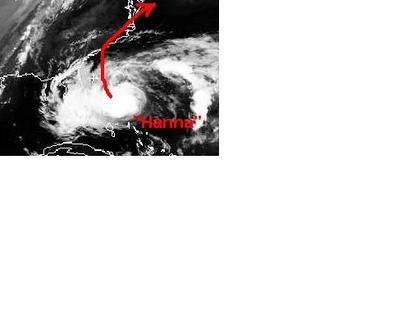 Der Tropensturm 'Hanna' verlässt langsam die Bahamas und zieht auf die Südostküste der USA zu. Zurzeit erreicht er mittlere Windgeschwindigkeiten von 100, in Böen um 120 km/h. Berechnungen zufolge soll er am Samstag auf die Küste von North-Carolina treffen. (Bildquelle: NERC Satellite Receiving Station, Dundee University, Scotland, http://www.sat.dundee.ac.uk/)