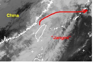 Der Taifun 'Jangmi' hat Taiwan überquert und sich zum Tropensturm abgeschwächt. Zurzeit erreicht er mittlere Windgeschwindigkeiten von 111, in Böen 139 km/h. Berechnungen zufolge soll er sich nur noch wenig abschwächen und Richtung Nordosten ziehen. Sein Endziel ist allerdings noch unklar. (Bildquelle: NERC Satellite Receiving Station, Dundee University, Scotland, http://www.sat.dundee.ac.uk/)