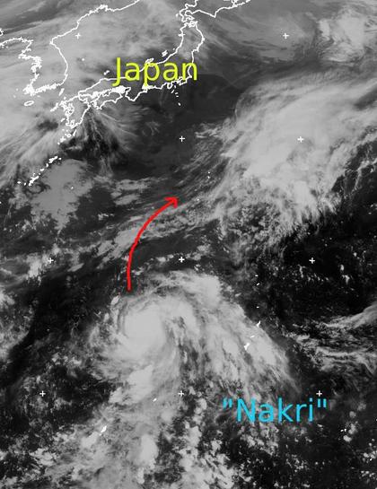 Über dem Westpazifik südlich von Japan liegt heute der Tropensturm 'Nakri' mit Windgeschwindigkeiten von 65 km/h im Mittel und 85 km/h in der Spitze. Es zieht nun Prognosen zufolge in nordöstliche Richtung weiter und verstärkt sich dabei. Möglicherweise erreicht er am Wochenende die Ogasawara-Inseln südlich von Japan. Japan selber bleibt vermutlich vom Tropensturm, der sich auch noch zum Taifun auswachsen könnte, verschont. (Bildquelle: Copyrigt EUMETSAT, NERC Satellite Receiving Station, University of Dundee)